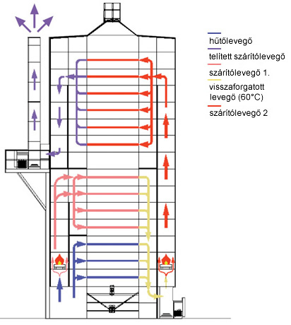 A szárítólevegőt újrahasznosító, hővisszanyerő rendszer a mintegy 60-70°C-os (a hűtő szintből és a középső szintből kilépő) szárítólevegőt újra felmelegíti és továbbítja a felső szintre.